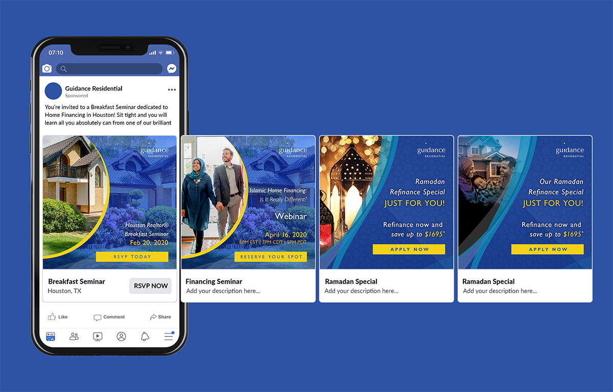 Guidance Residential is a financing company that specializes in providing Shariah-Compliant home financing for Islamic-Americans. The company’s purpose is to establish trust, convey reliability, and evoke a sense of warmth and security associated with building a home. As an in-house designer, I collaborated closely with the marketing team and software engineers to uphold the company’s brand identity and produce various campaigns, websites, and mobile apps.
