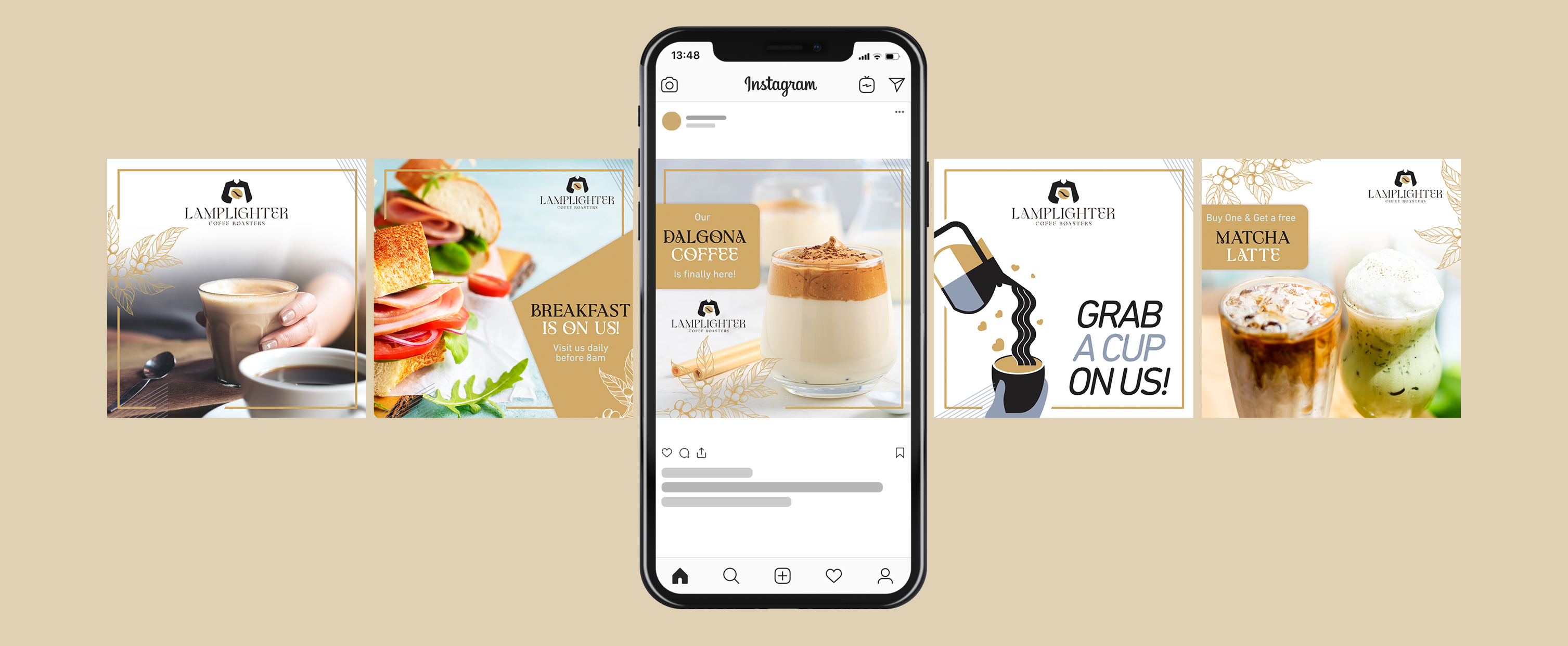 The main focus of the Lamplighter project was to modernize the coffee shop’s visual identity and create a cohesive brand experience. This included redesigning the logo, menu, signage, and promotional materials, all while maintaining the essence of the coffee shop’s welcoming and community-focused atmosphere. To begin my redesign, I first chose to enhance the coffee shop’s digital presence by incorporating newfound design elements into their social media graphics and website updates. This helped me move on to the rebrand of their packaging.
