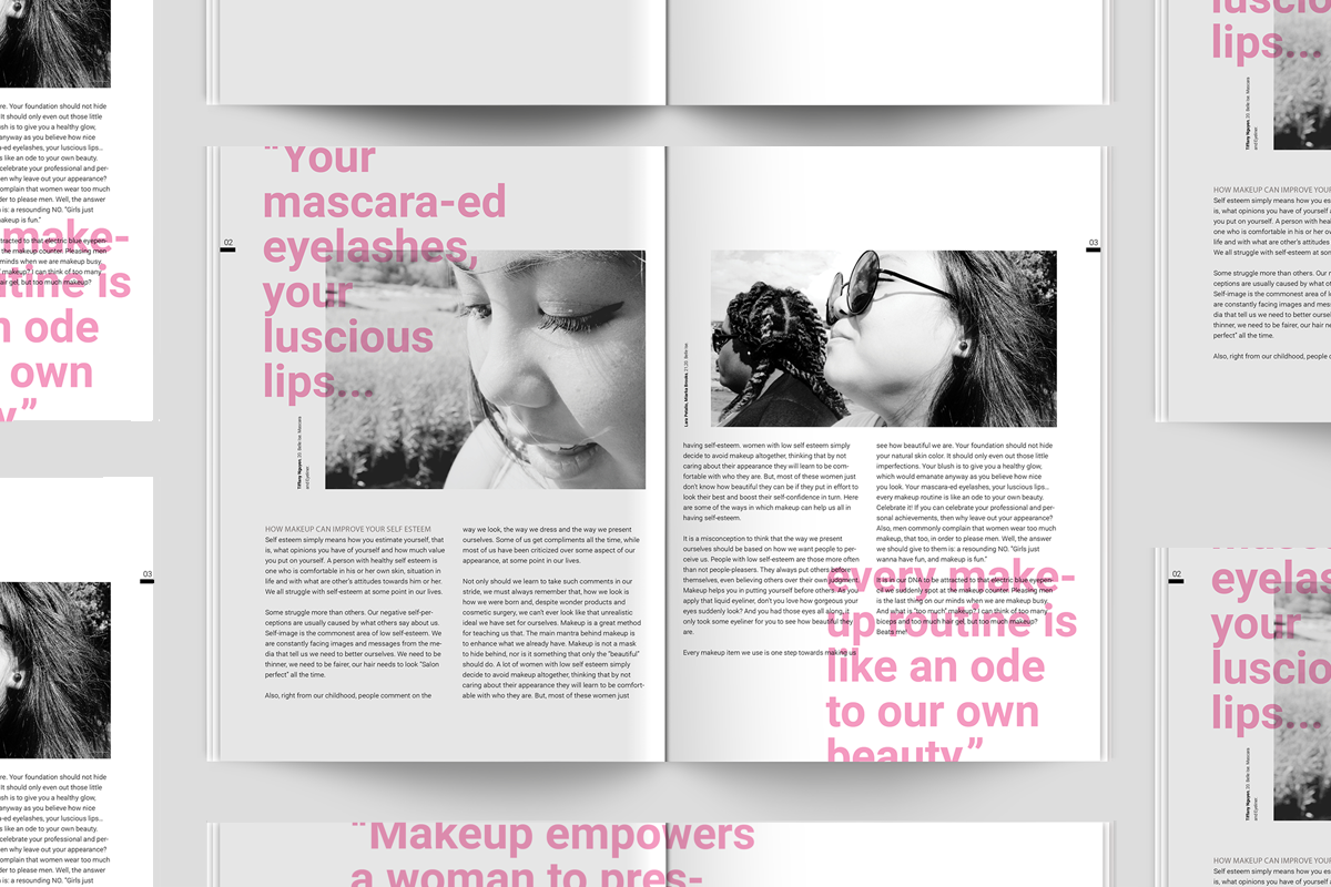 Self Expression is a non-profit publication dedicated to women’s beauty and style. The primary focus is on minimalism, reflecting the campaign’s efforts to promoting natural beauty. I was tasked with the photography and design of the layout.